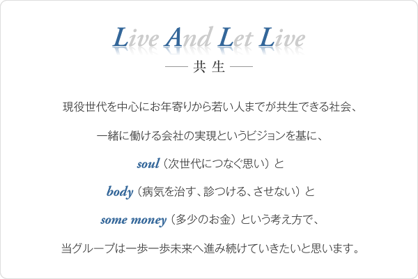 LALLグループの医療福祉事業では、元気に美しく長生き”を目指し、幅広く皆様のQOL(Quality Of Life=生活の質)の改善に努力し、真の健康のお役に立つことをモットーに取り組んでいます。